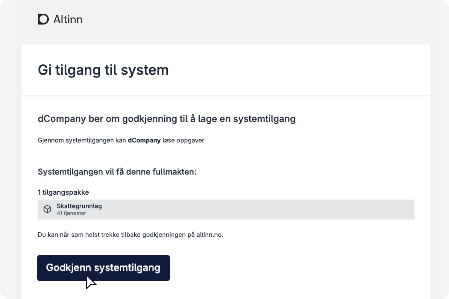 For at dCompany skal kunne sende inn aksjonærregisteroppgaven på vegne av selskapet, må dCompany-plattformen først ha systemtilgang til tjenesten for aksjonærregisteroppgaver i Altinn.