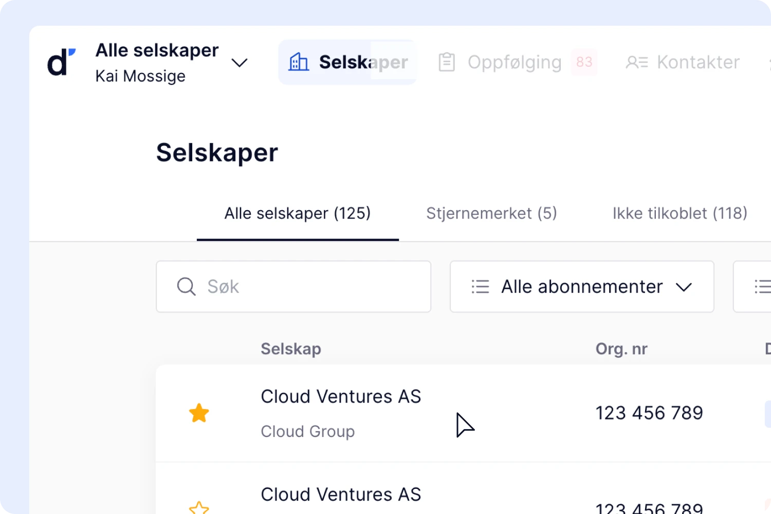 💡 Tips. Hvis selskapet vises flere ganger i listen, velg da den raden som er markert med Admin, Daglig leder, Styreleder eller tilsvarende-