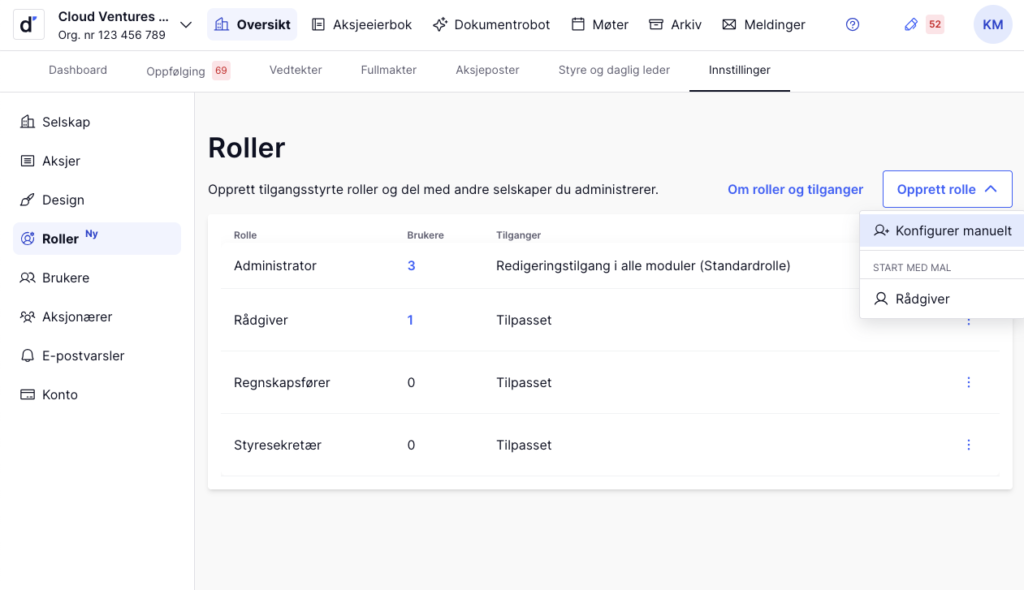- Gå til Oversikt > Selskapsinnstillinger > Roller