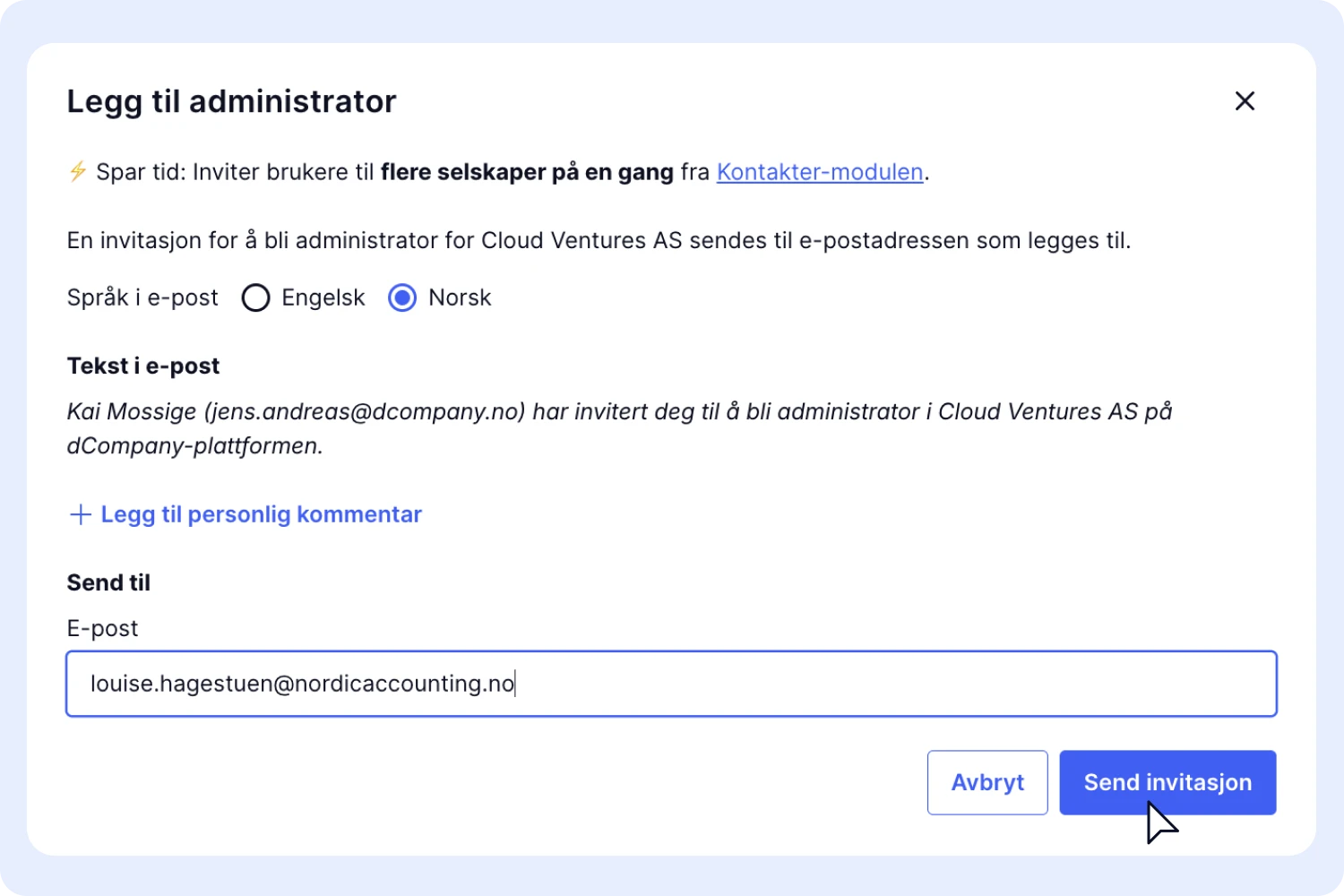 En invitasjon for å bli administrator i selskapet vil nå sendes til den e-posten du har lagt inn.