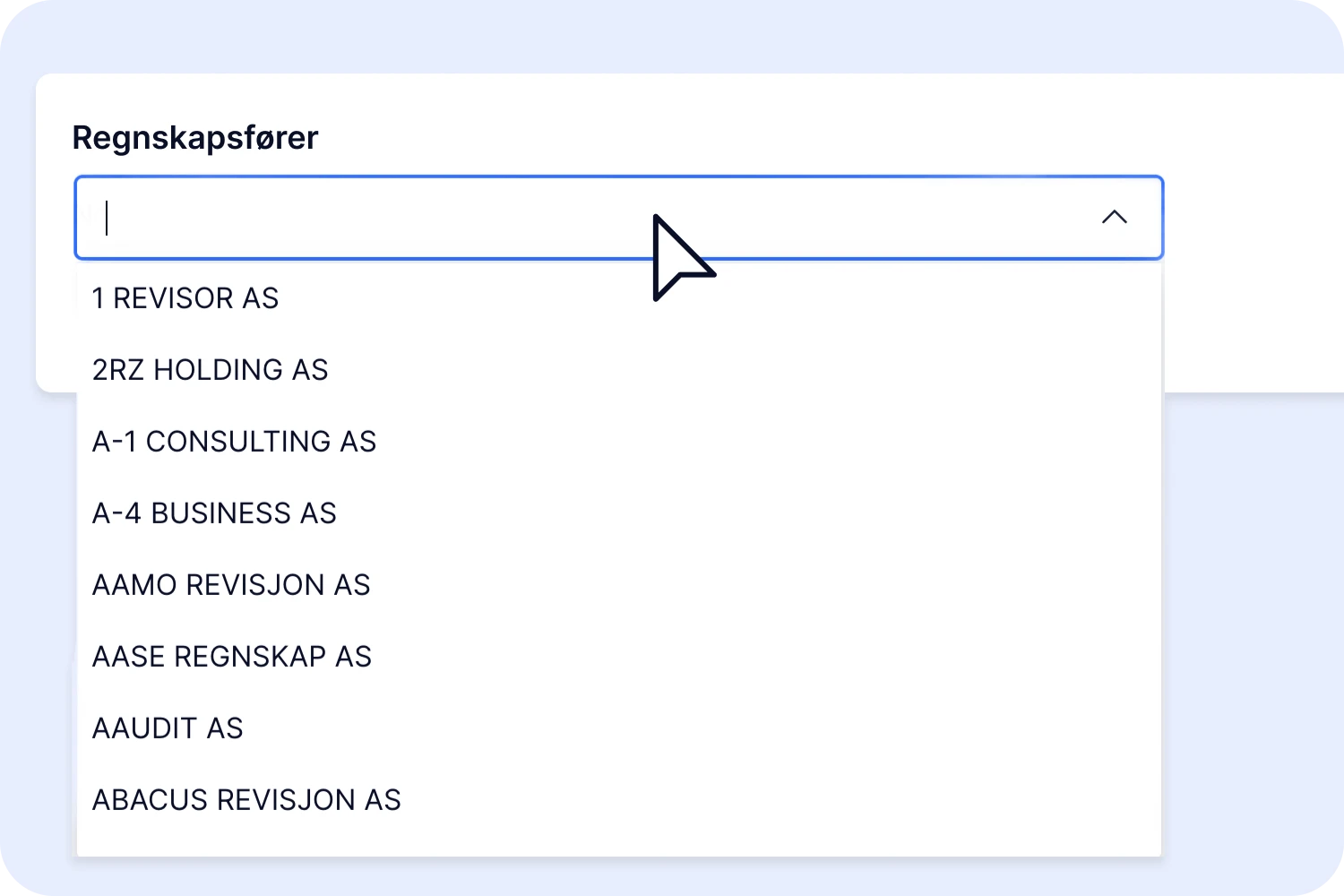 I seksjonen Regnskapsfører, søk og velg din regnskapsfører. Deretter velg Lagre.