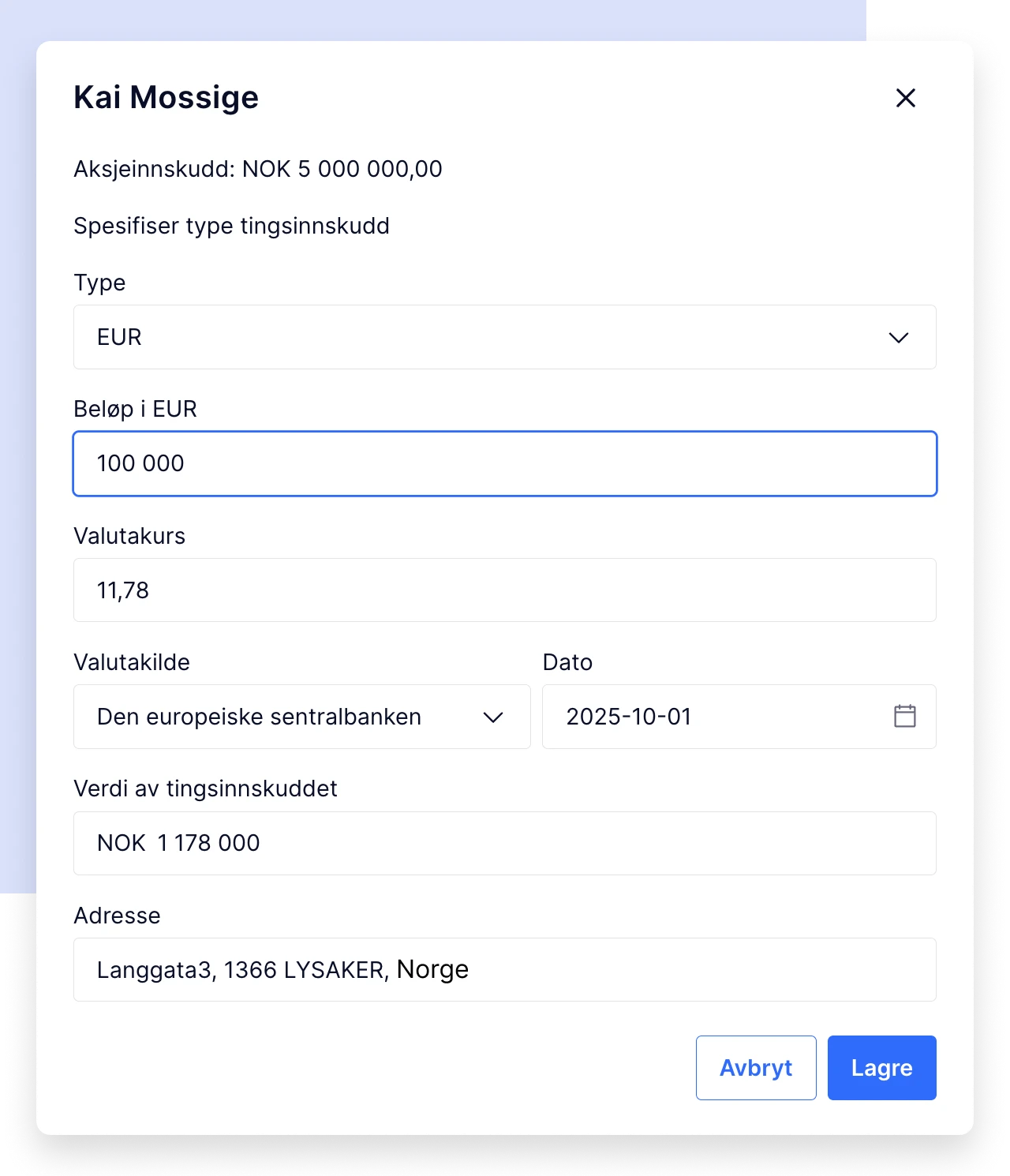 dCompany støtter nå kapitalinnskudd i utenlandsk valuta (regnes som tingsinnskudd). Funksjonen gjør det enkelt å håndtere kapitalforhøyelser der aksjeinnskuddet gjøres opp mot andre penger enn NOK (velg USD, EUR, SEK, DKK eller annen valuta). Dette er en populær funksjon for våre fondskunder.