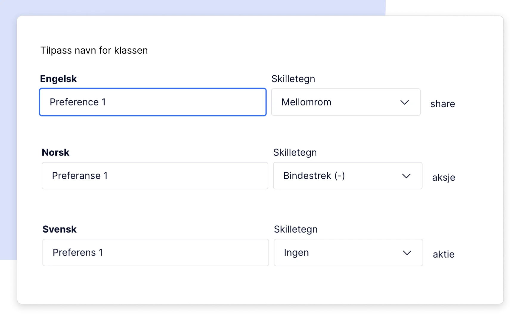 - Eller legg til egendefinerte navn når du oppretter nye klasser via selskapsinnstillinger, transaksjoner eller Dokumentroboten.