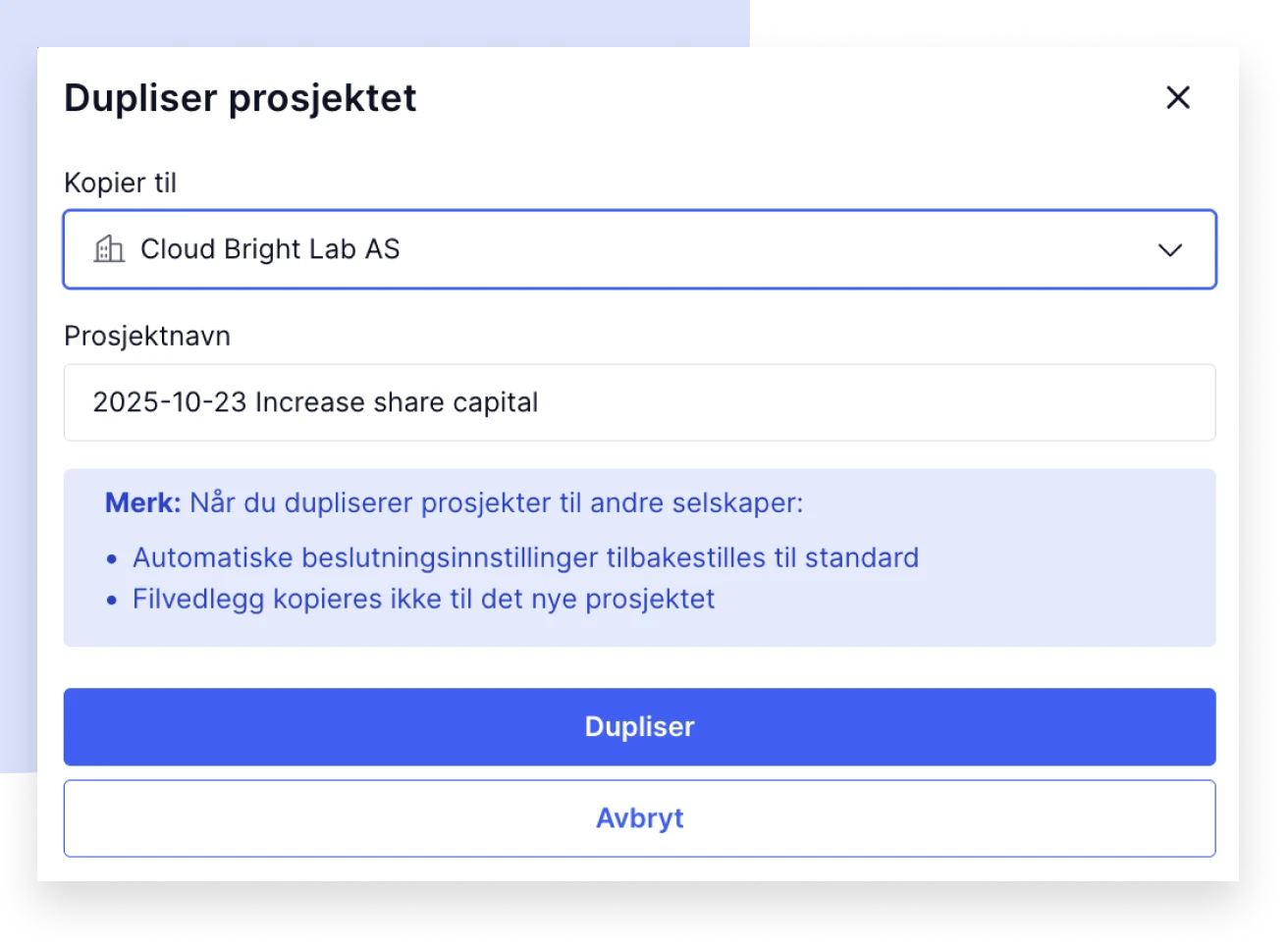 - Duplisering av prosjekter: Det er nå mulig å duplisere prosjekter til andre selskaper man administrerer