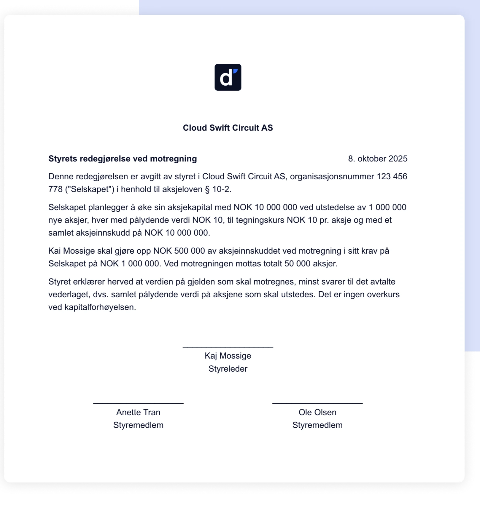 Styrets redegjørelse ved motregning brukes når selskapet utsteder aksjer der forpliktelsen til å gjøre opp aksjeinnskuddet skjer ved motregning i stedet for kontant betaling.