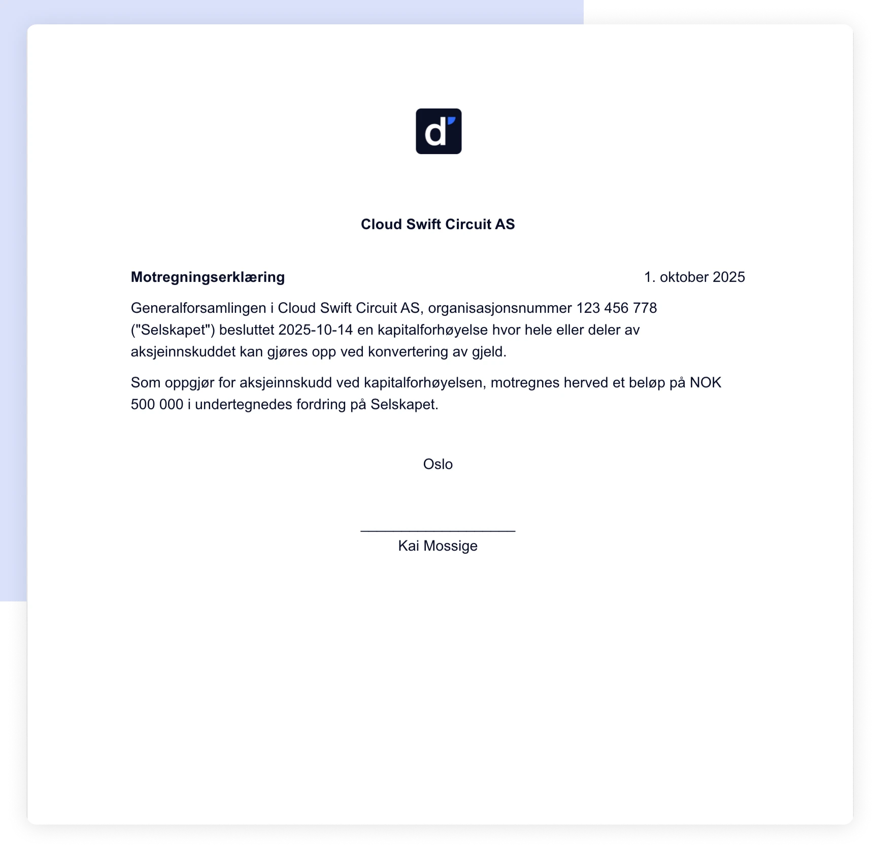 Når aksjeinnskuddet skjer ved motregning, må den som skal gjøre opp aksjeinnskuddet avgi en motregningserklæring. Revisor vil kreve dette som dokumentasjon for at aksjeinnskuddet er gjort opp.