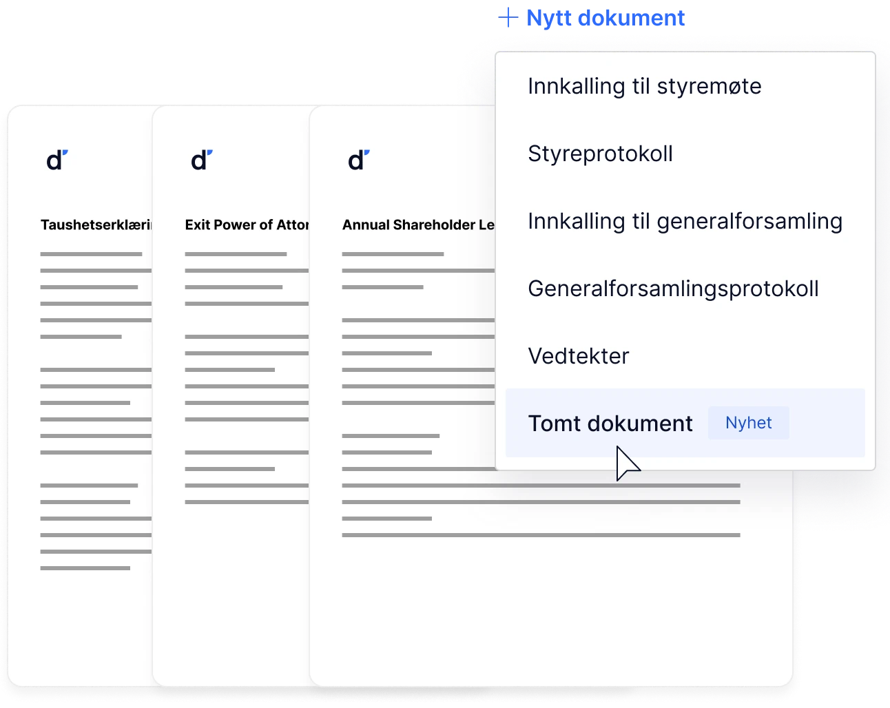 Dokumentrobot har nå fått støtte for fritekst brev, avtaler, fullmakter, erklæringer, vilkår m.m. Denne funksjonen gir deg full frihet til å lage generelle eller individualiserte dokumenter til en eller flere mottakere og sende disse ut til informasjon eller for undertegning. Eksempler er utsendelse av aksjonærbrev eller innhenting av fullmakter fra samtlige aksjonærer i forbindelse med et salg. I prinsippet kan du lage hvilket som helst dokument.