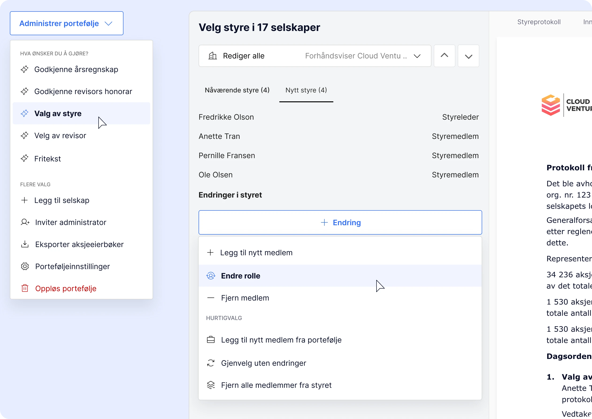 Legg inn endringer, og få god oversikt over styret både før og etter endringen per selskap.