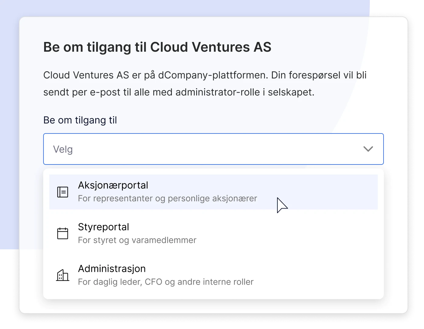 Hvis selskapet man ønsker tilgang til ikke allerede er på dCompany-plattformen, sendes forespørselen til styreleder eller daglig leder som før.
