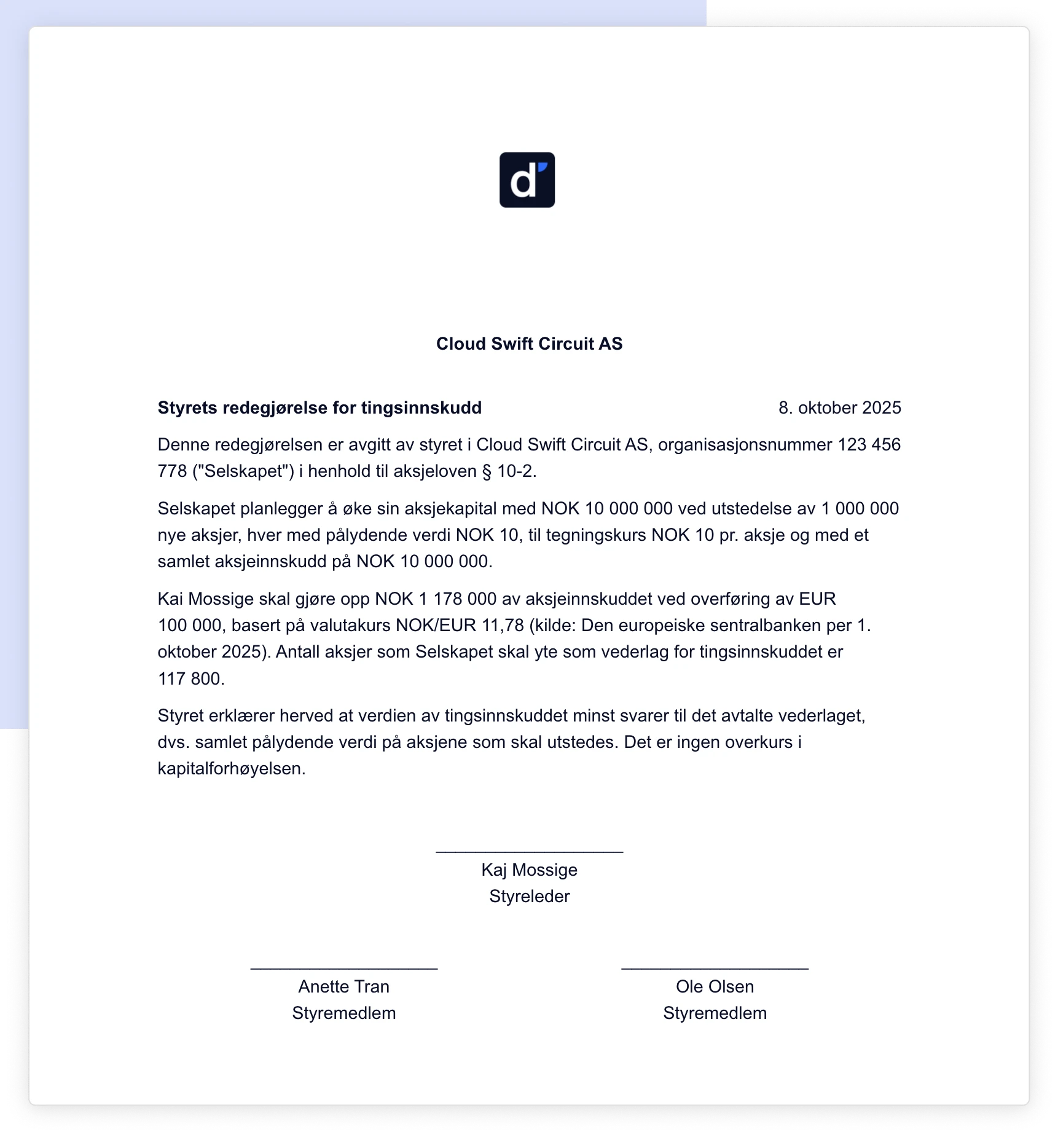 Dokumentet er obligatorisk ved kapitalforhøyelser der aksjeinnskuddet skjer ved gjeldskonvertering.